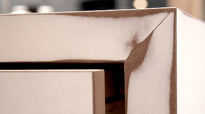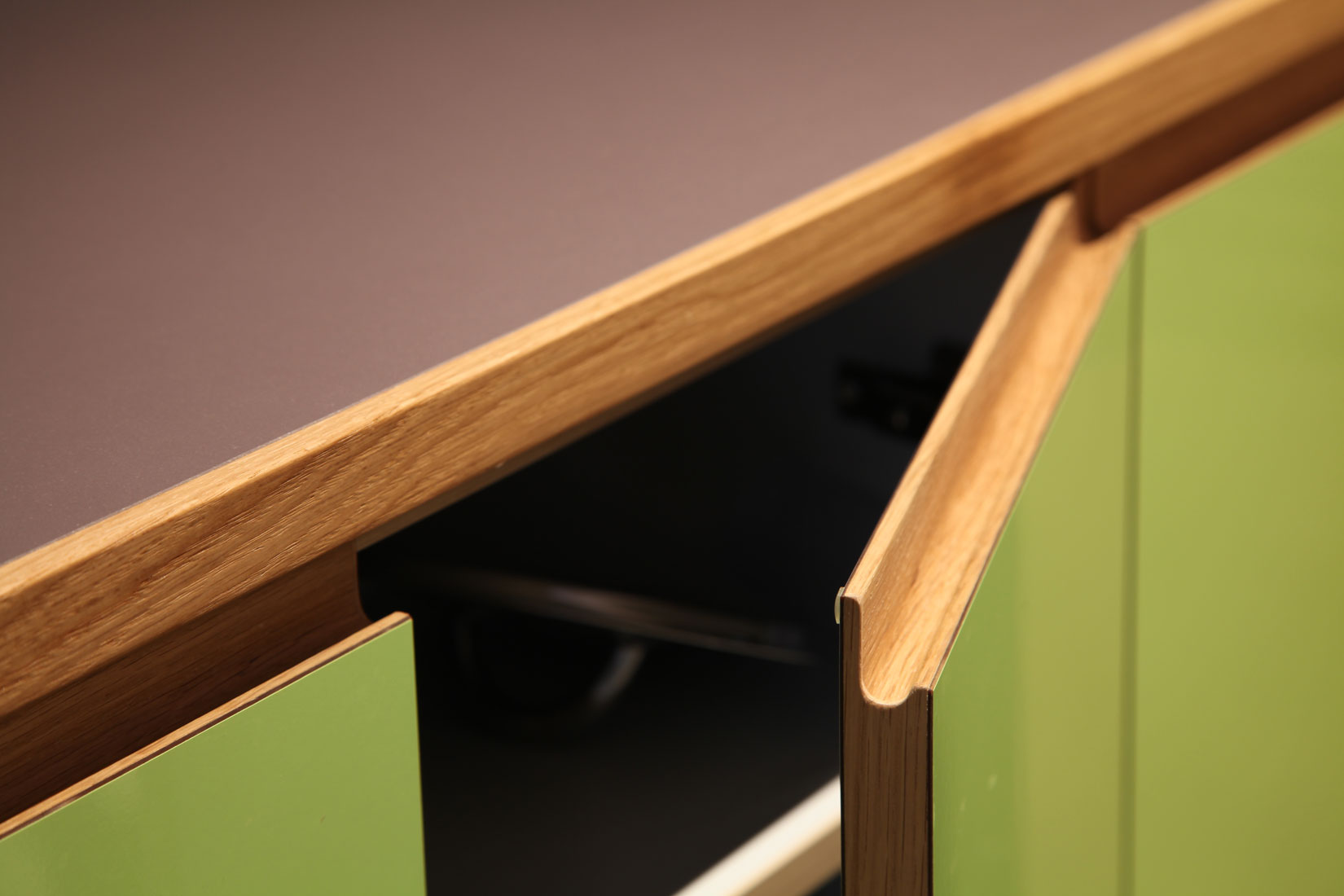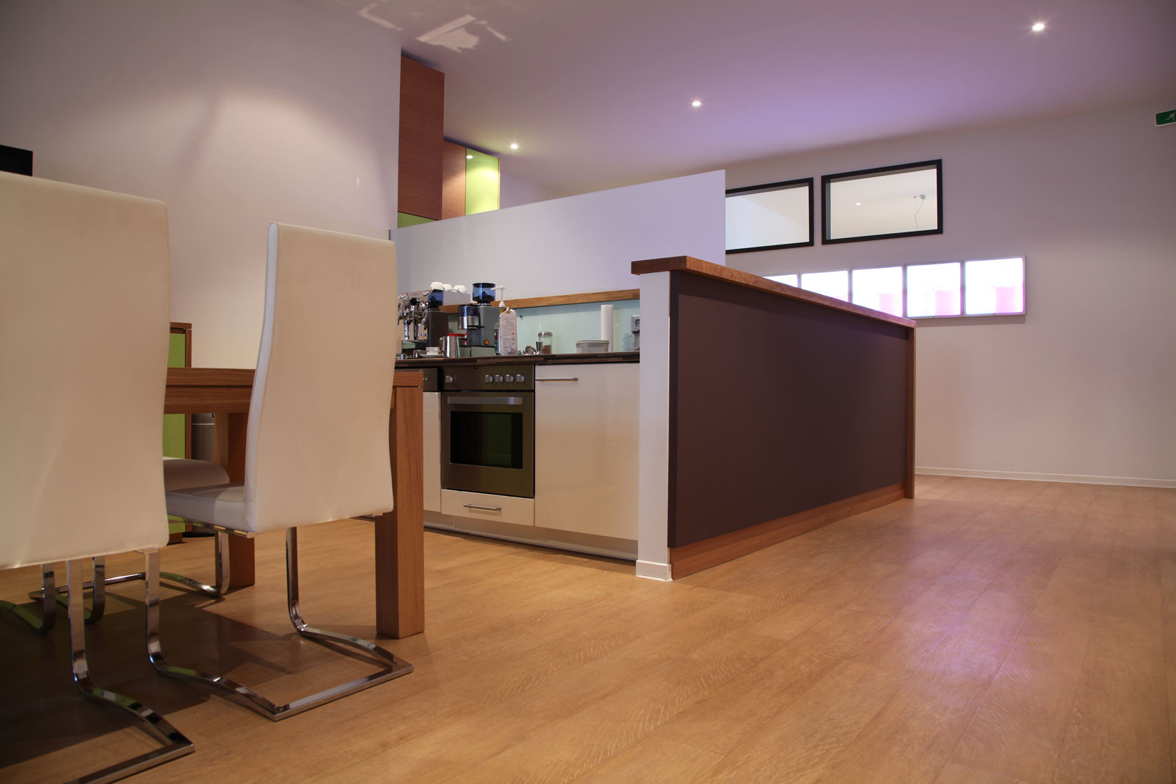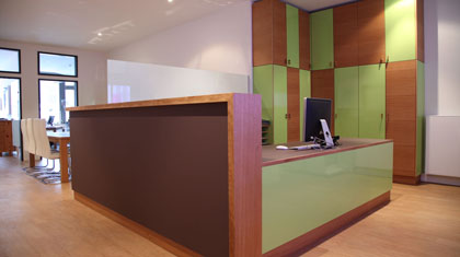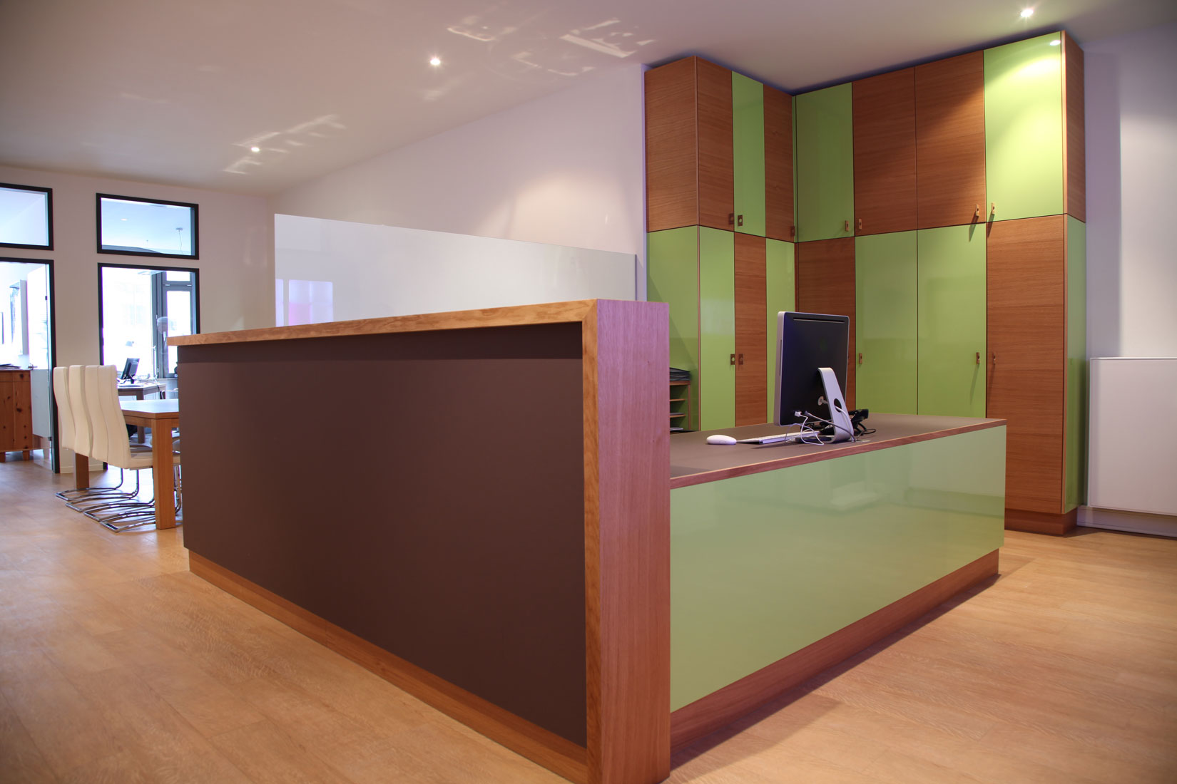 Der integrierte Empfangs- und Konferenzbereich dieser Kanzlei orientiert sich an der Idee der offenen Küche. Die Mischung von Edelhölzern und hochglänzend lackierten Oberflächen schafft ein ideales Umfeld für gemeinsames Arbeiten und vermittelt dem Mandanten Transparenz.