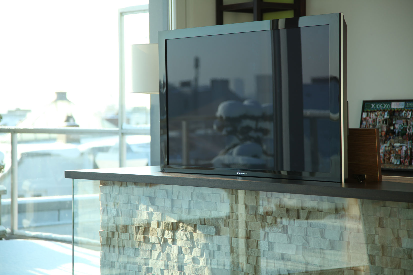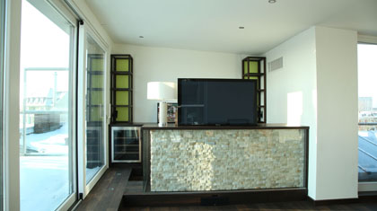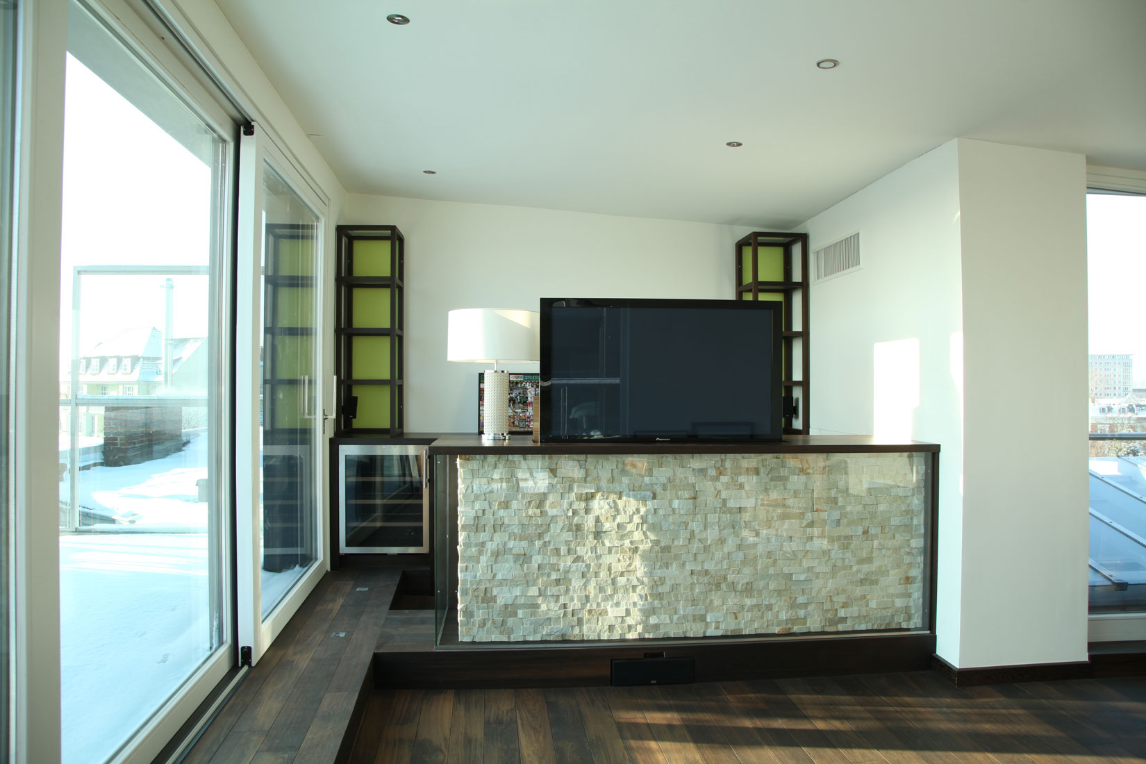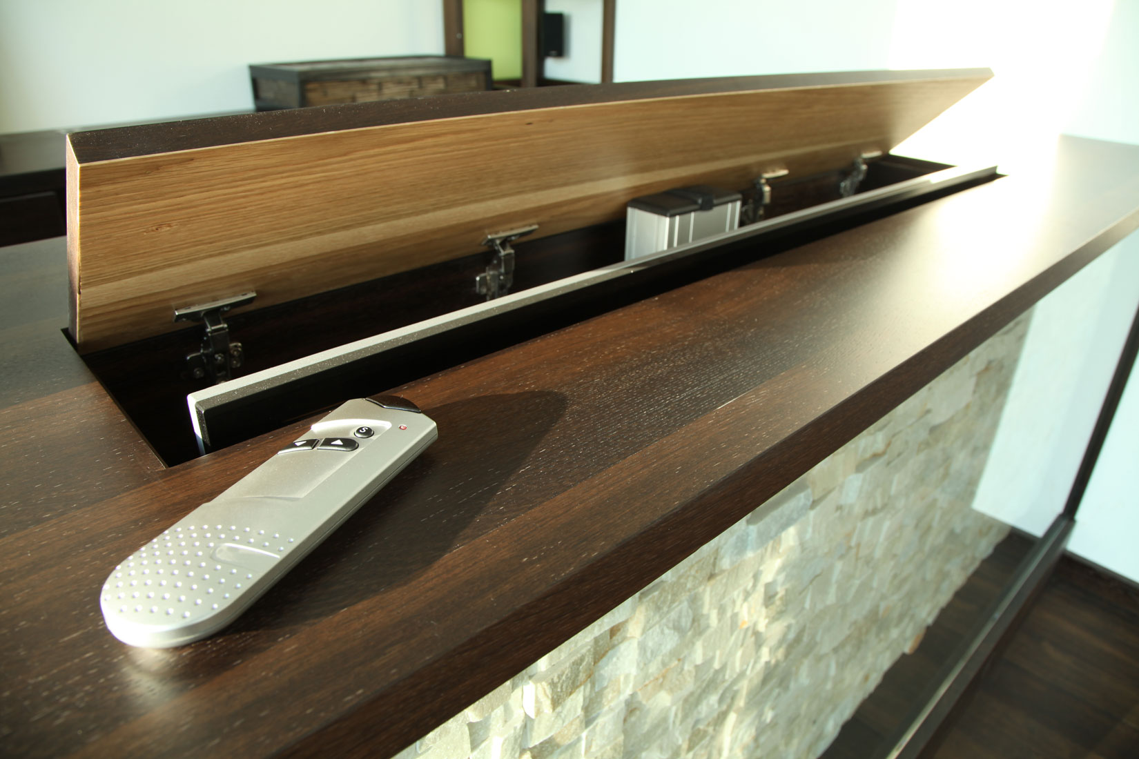 Nachdem das Äußere diese Tresens bereits ausgiebig gewürdigt wurde, wollen wir uns jetzt noch kurz den inneren Werten zuwenden. Die komplette Gastronomieausstattung teilt sich den Raum mit einer hochwertigen Hifi-Anlage und einem jamesbondartig zu versenkenden Flachbildschirm.