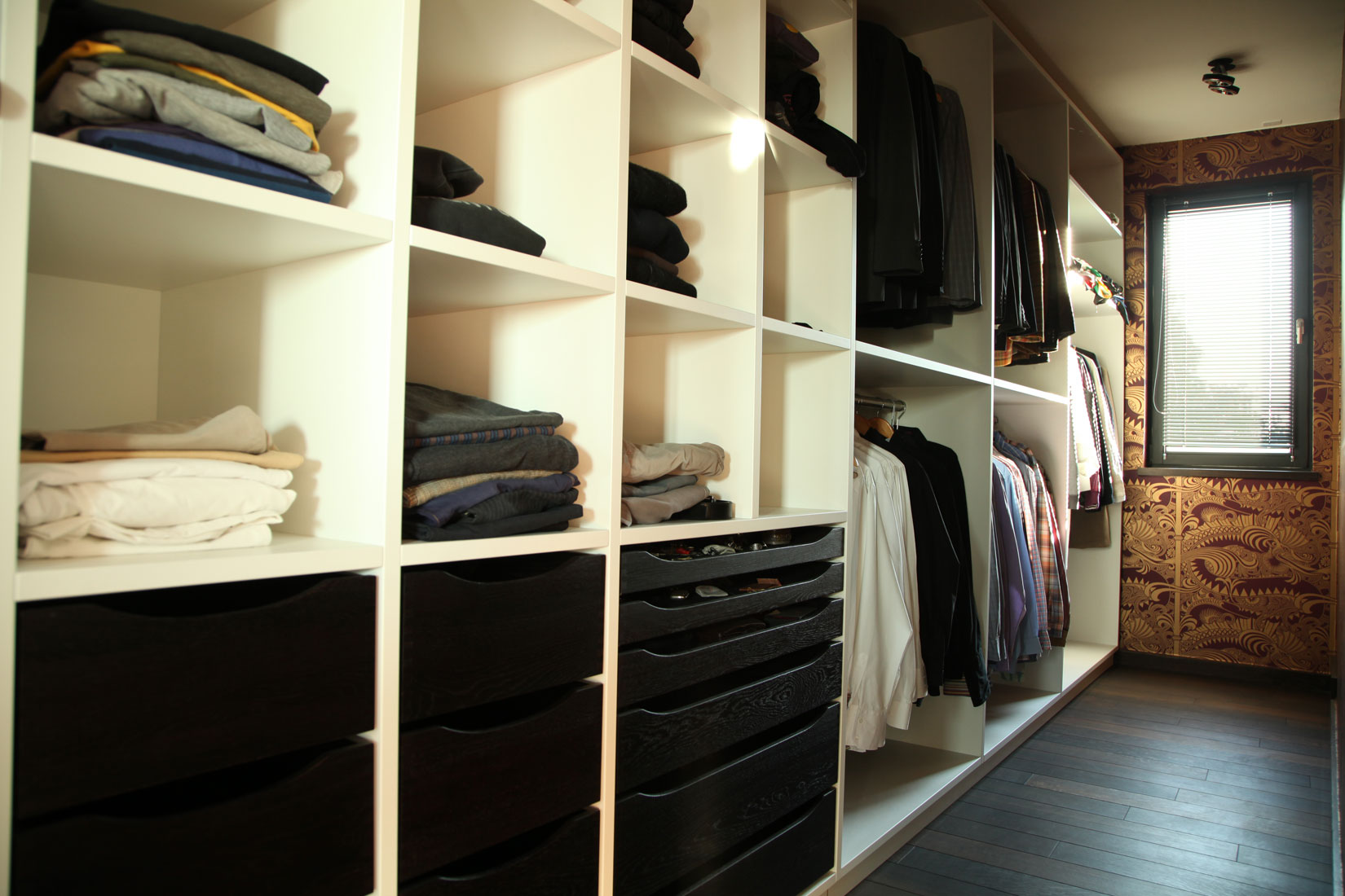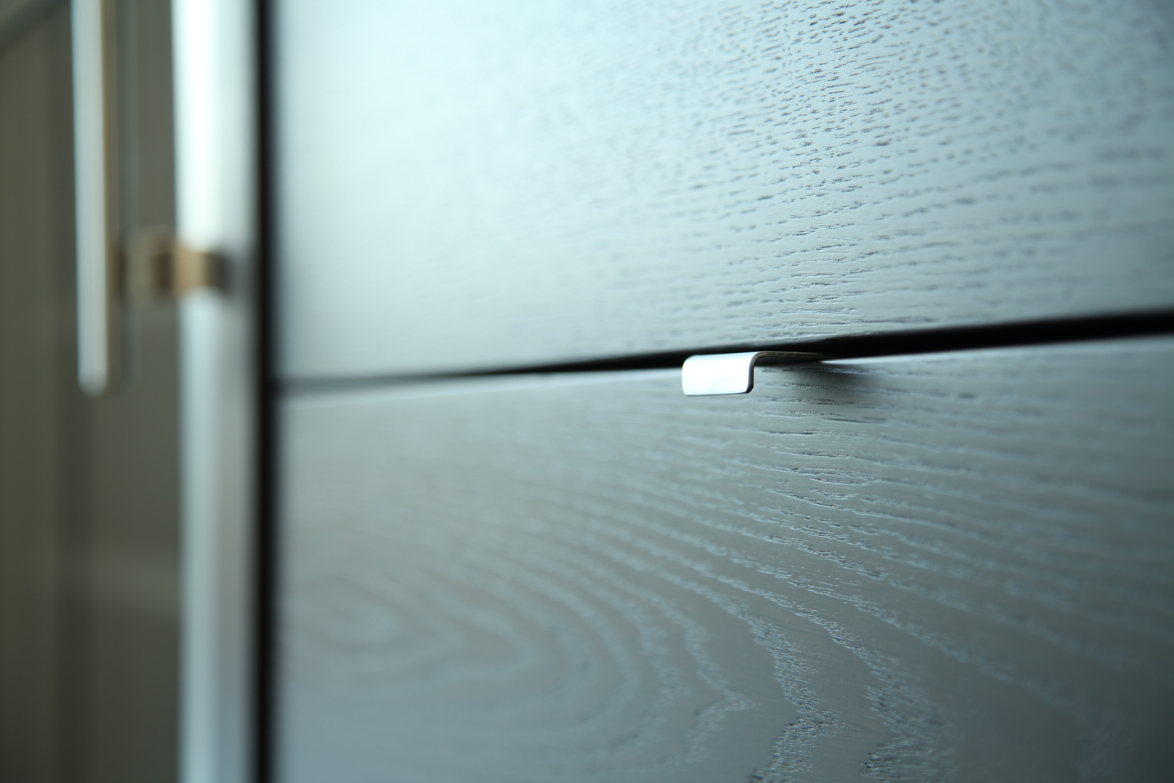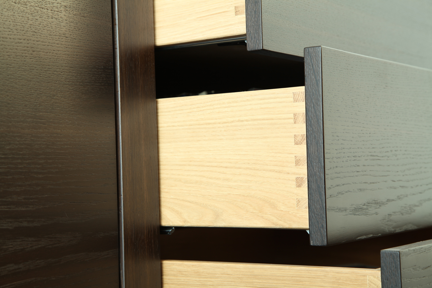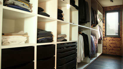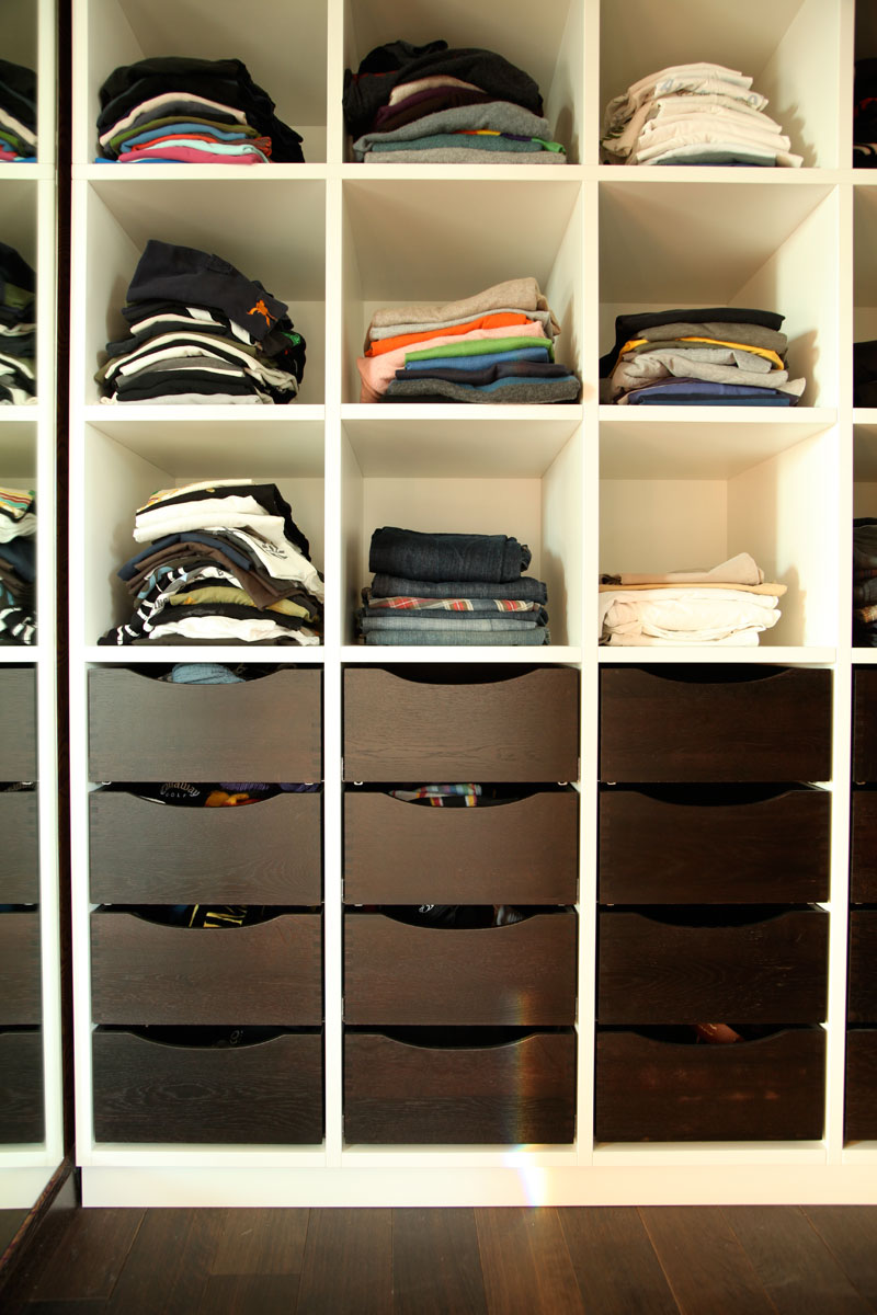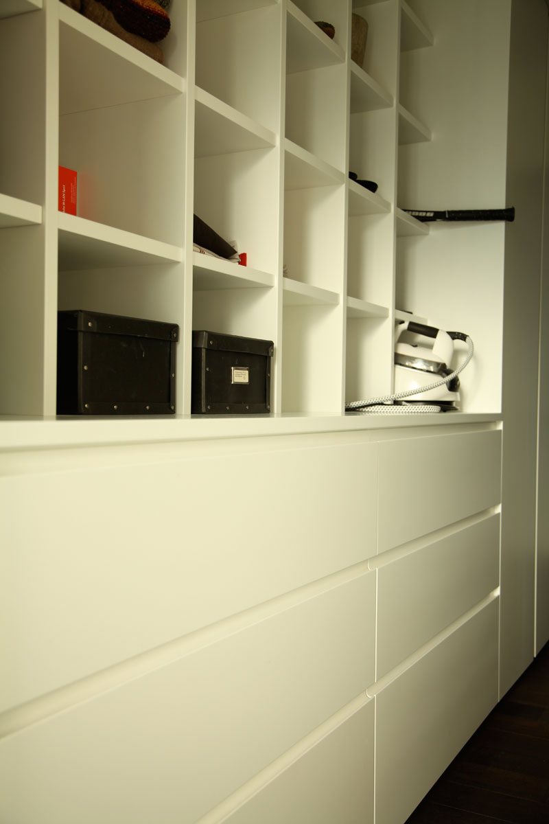 Im Gegensatz zu den meisten begehbaren Kleiderschränken möchte man diesen mit seinen hochglanz-lackierten oder gebeizten Eichenschubladen fast schon bewohnen, statt ihn nur zu begehen. Der hohe Grad an Funktionalität macht es darüber hinaus fast zu einem Vergnügen, Ordnung zu halten.
