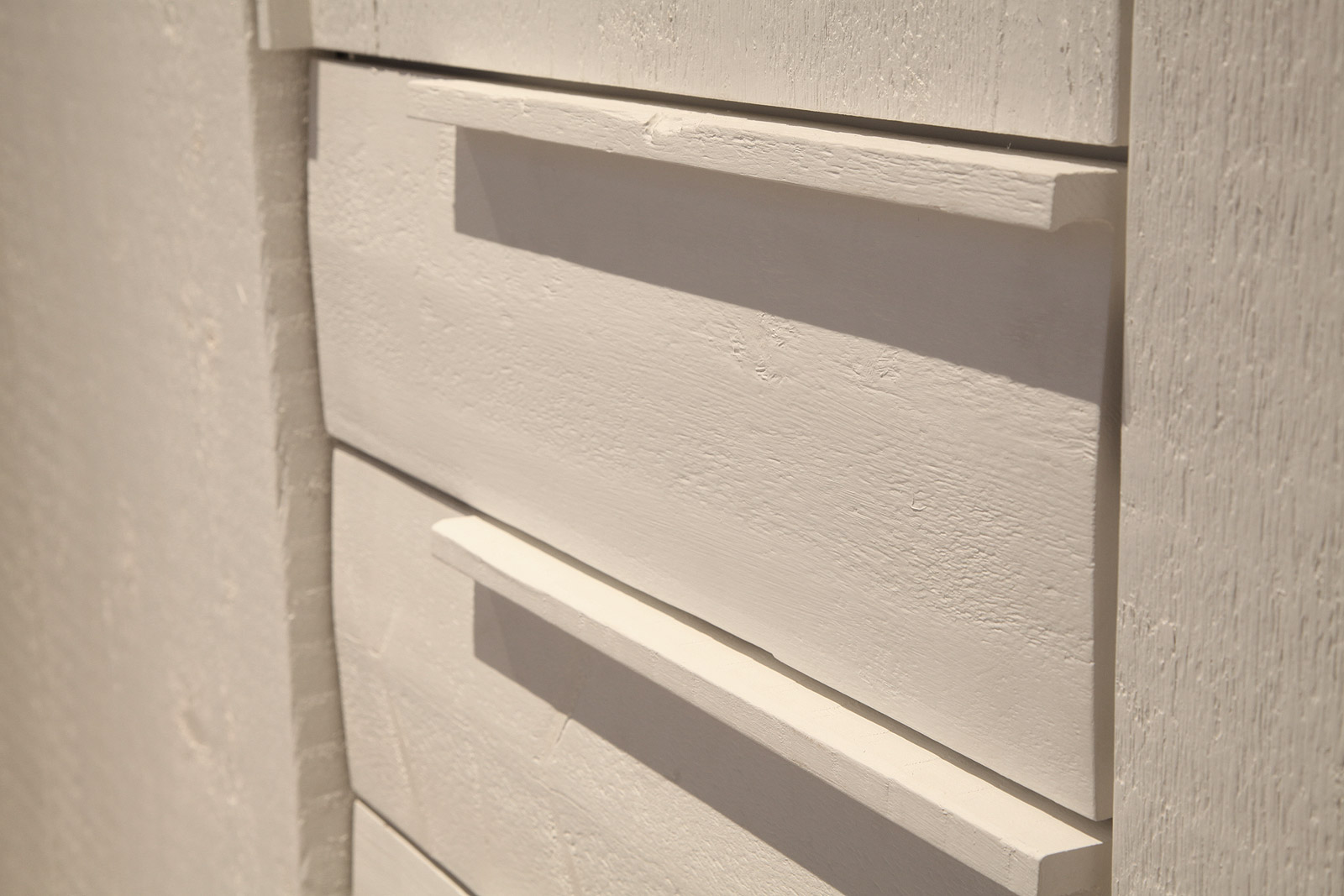 Puristisch, Geometrisch und Weiß treffen auf eine im Wortsinn raue Schale. Der in Form gebrachte Gegensatz besticht gleichermaßen durch die ihm innewohnende handwerkliche Perfektion wie durch die Kühnheit des Entwurfs. Das Ergebnis ist eine aufregende Neuinterpretation des auf einmal gar nicht mehr altbackenen Themas Schrankwand.