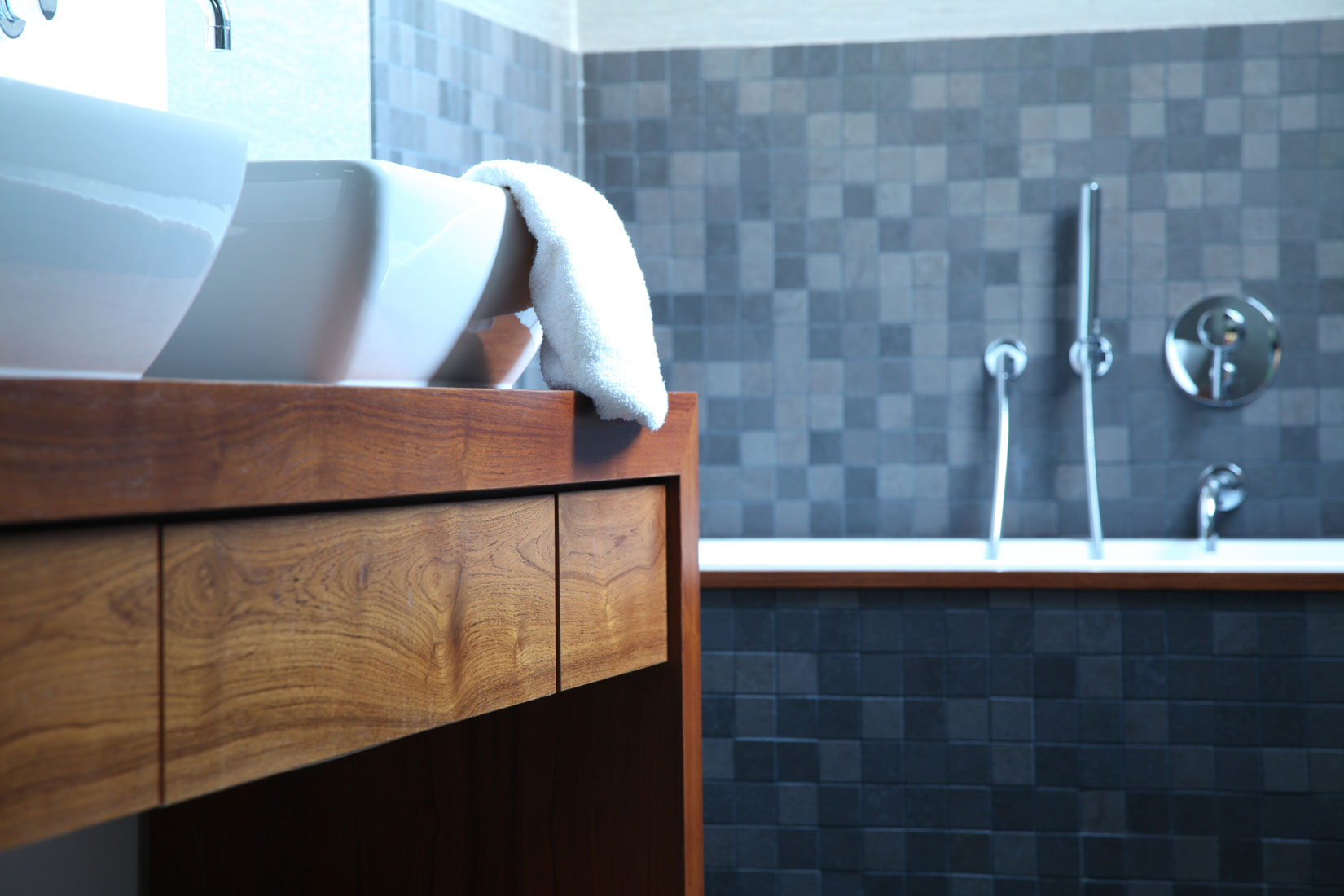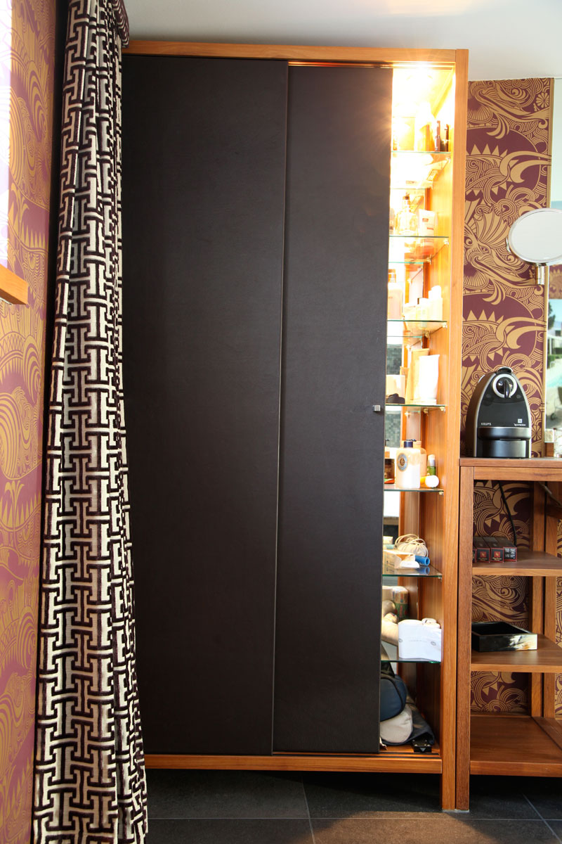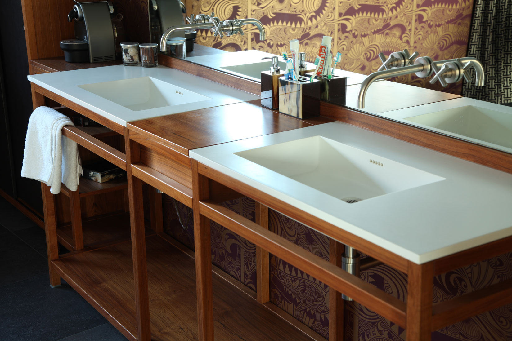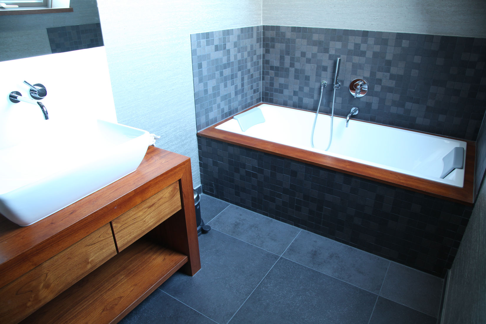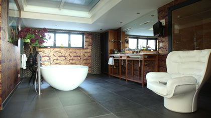 Teakholz und Leder verleihen diesem Badezimmer eine einzigartige Ausstrahlung. So etwas kann nur entstehen, wenn kühne Pläne auf begnadete Hände treffen.