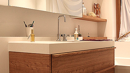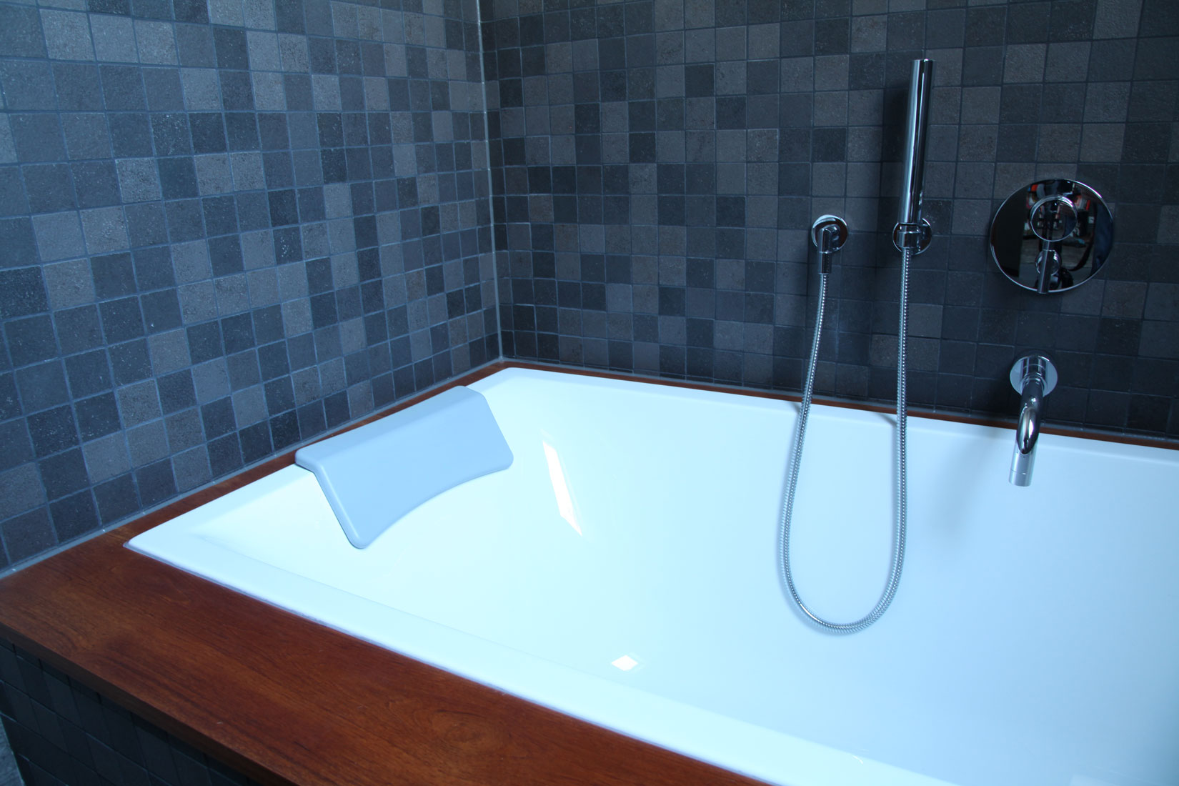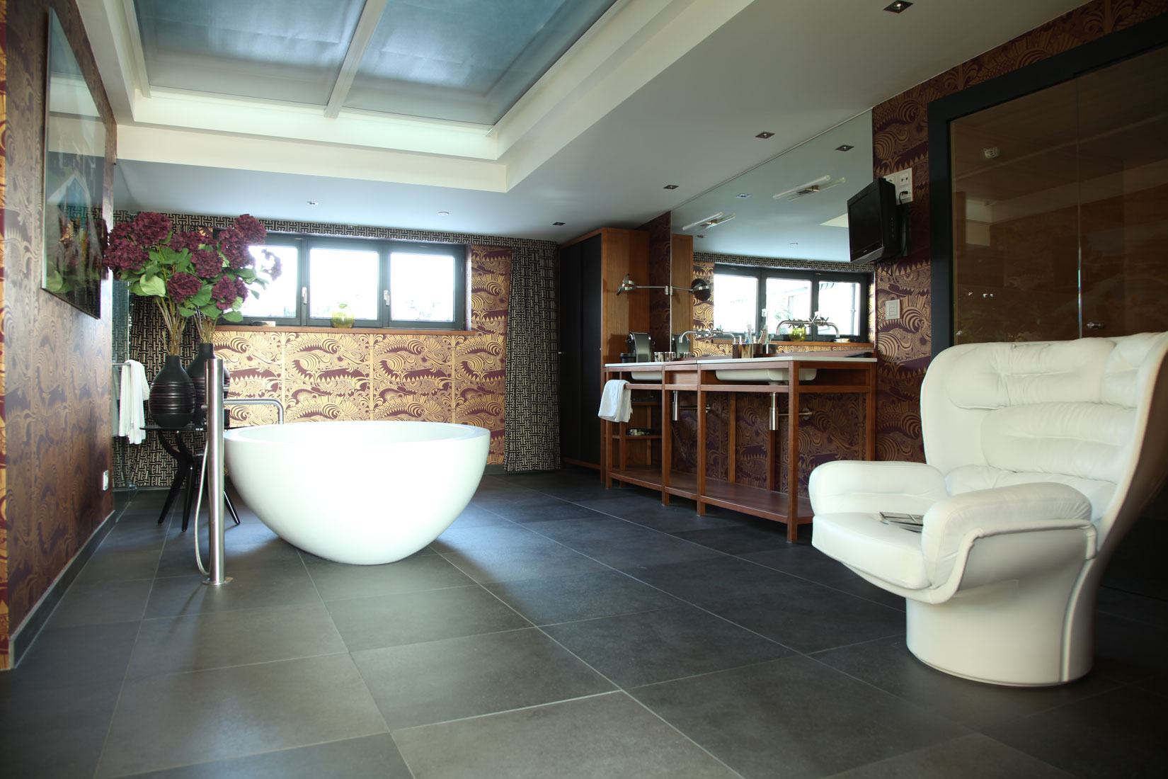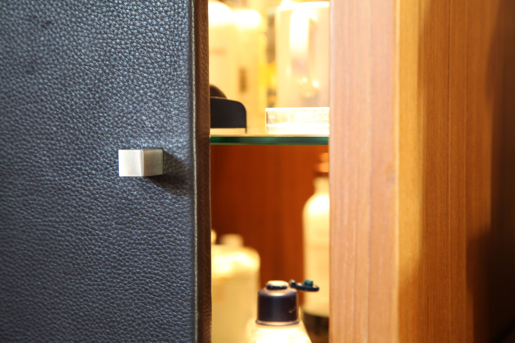 Teakholz und Leder verleihen diesem Badezimmer eine einzigartige Ausstrahlung. So etwas kann nur entstehen, wenn kühne Pläne auf begnadete Hände treffen.