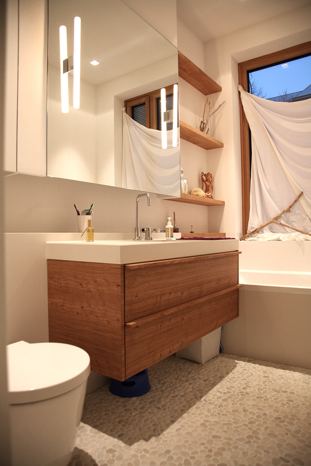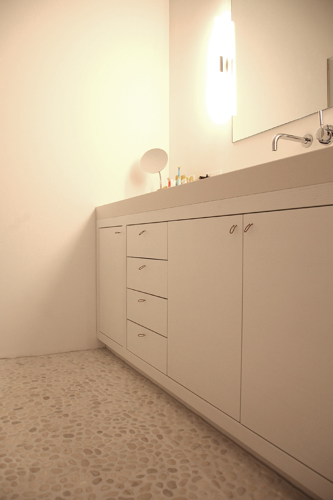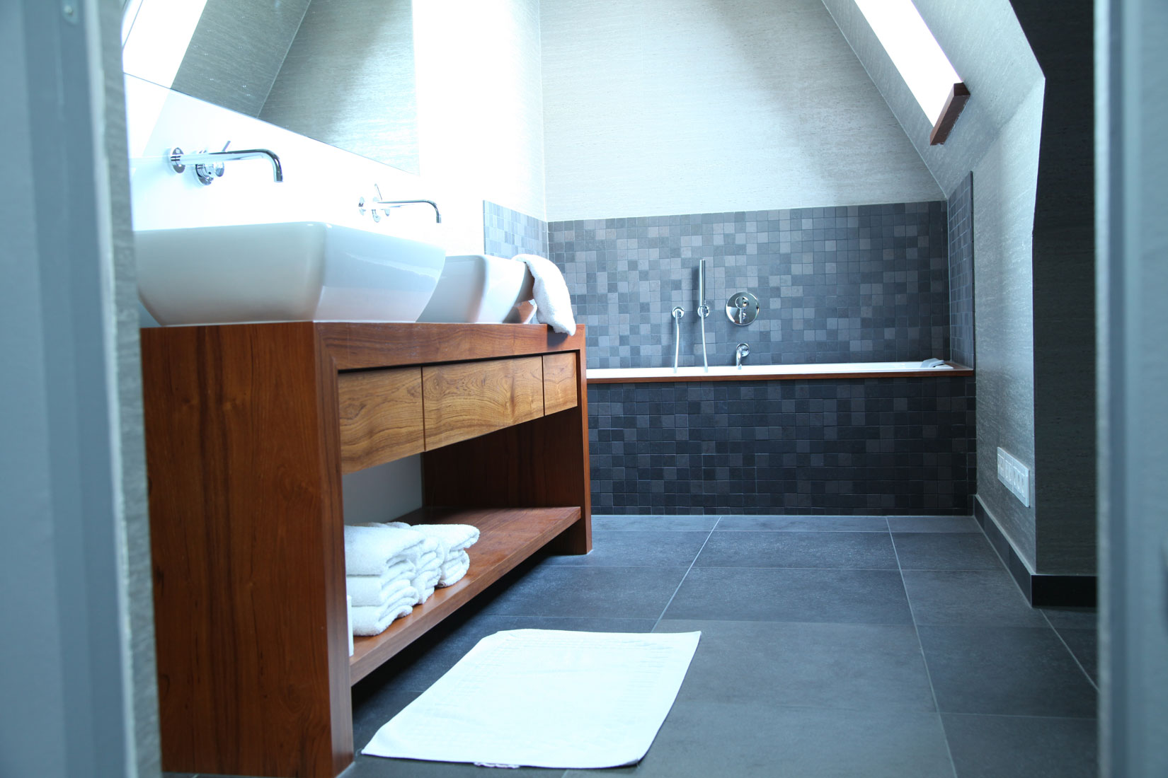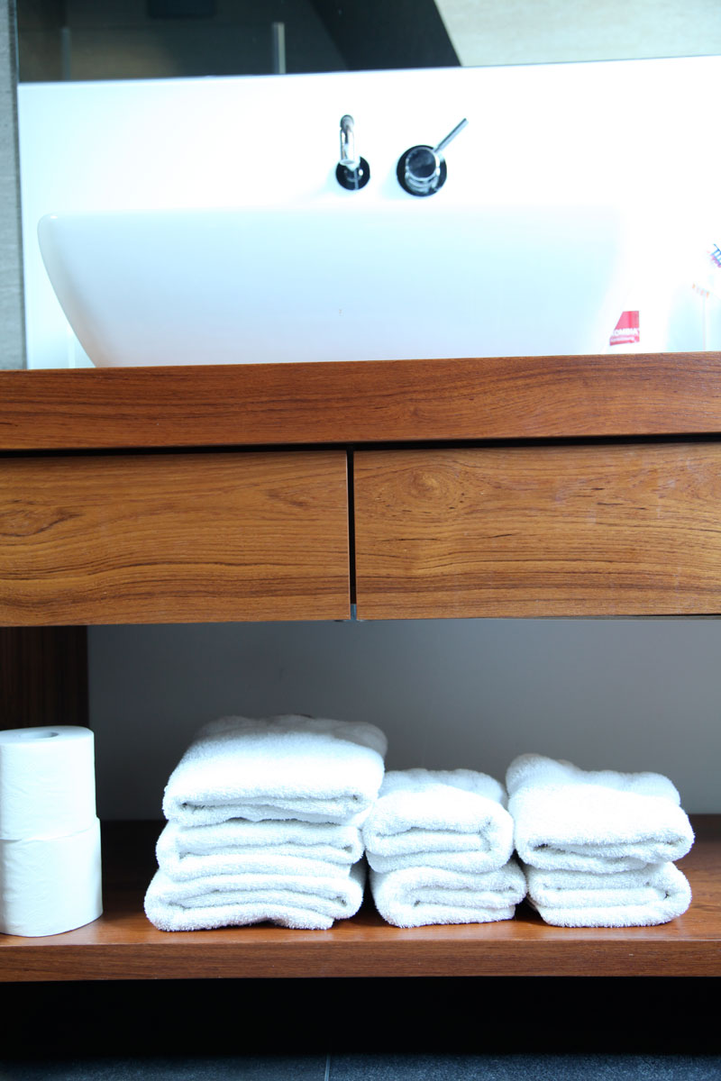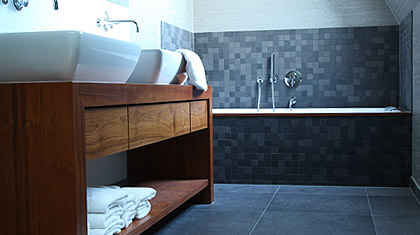 Dass ein Bad durchaus mehr sein kann als eine öde weiße Kachelwüste beweist dieses Potpourri aus warmen Naturtönen und einem wunderschönen Kopfsteinpflasterboden, der jede Badematte obsolet macht. Da steht man sogar gerne mal früher auf, um sich für die morgendlichen Verrichtungen soviel Zeit zu nehmen, wie dieser Nasszelle gebührt.